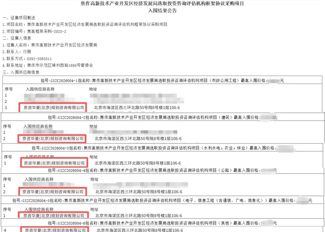 經過專家評審,京咨華夏(北京)規劃咨詢有限公司入圍“焦作高新技術產業開發區經濟發展局選取投資咨詢評估機構框架協議采購項目”。 入圍結果公示如下: